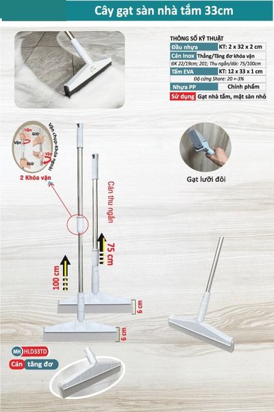 Cây gạt sàn nhà tắm 33cm là dụng cụ vệ sinh thông minh, giúp làm khô sàn nhanh chóng nhờ thiết kế lưỡi đôi 2 tầng gạt đặc biệt. Sản phẩm phù hợp sử dụng trong gia đình, xí nghiệp, công sở, hoặc các khu vực thường xuyên ẩm ướt.