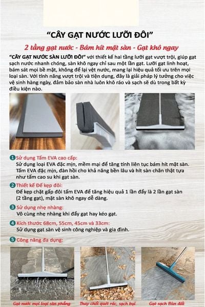 Thiết kế 2 lớp gạt giúp tăng gấp đôi hiệu quả: chỉ với một lần đẩy, nước được gom sạch như gạt hai lần liên tiếp, giúp sàn khô nhanh hơn và tiết kiệm thời gian dọn dẹp.Tấm EVA cao cấp, đặc mịn và mềm mại