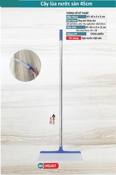 Cây lùa sàn nước 45cm là dụng cụ vệ sinh thiết yếu giúp làm khô sàn nhanh chóng và hiệu quả. Thiết kế bản lưỡi gạt rộng 45cm cho khả năng gom nước tốt, phù hợp sử dụng trong gia đình, nhà hàng, quán ăn, khách sạn, khu vệ sinh, khu vực sàn rộng hoặc thường xuyên tiếp xúc với nước.