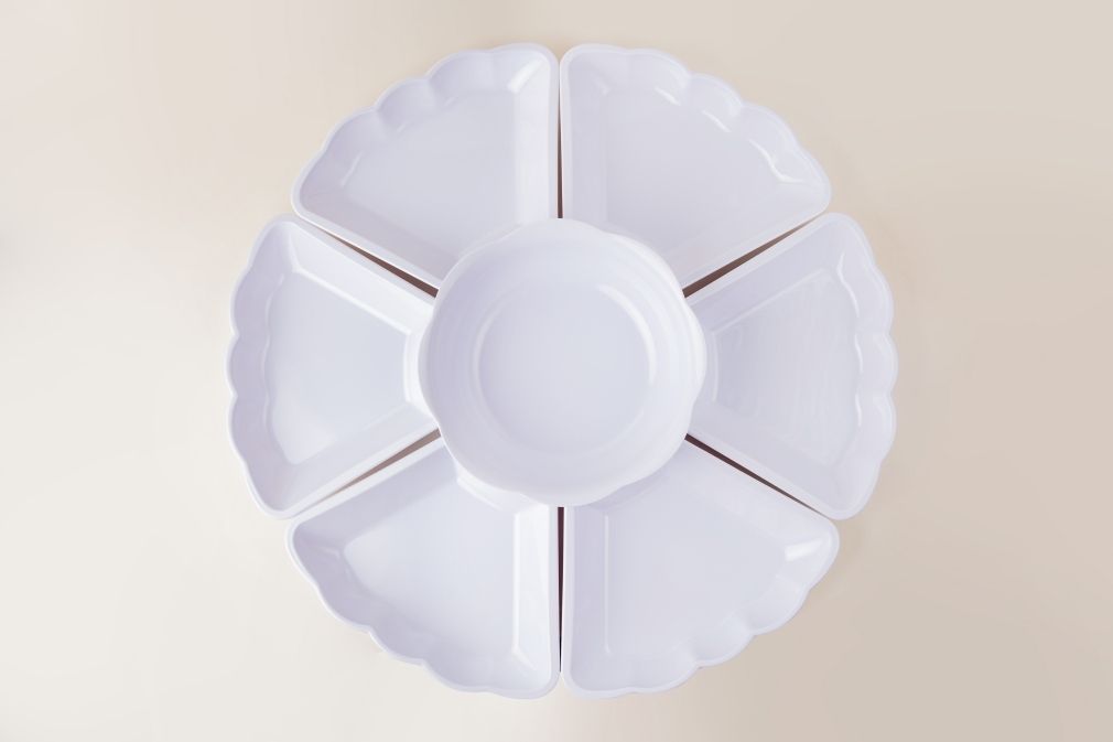 Bộ sản phẩm gồm tô trung tâm và các dĩa cánh hoa bao quanh, thuận tiện cho việc bày nhiều món cùng lúc như khô mực, trái cây, đồ nhúng, topping, đồ ăn vặt hay món khai vị.