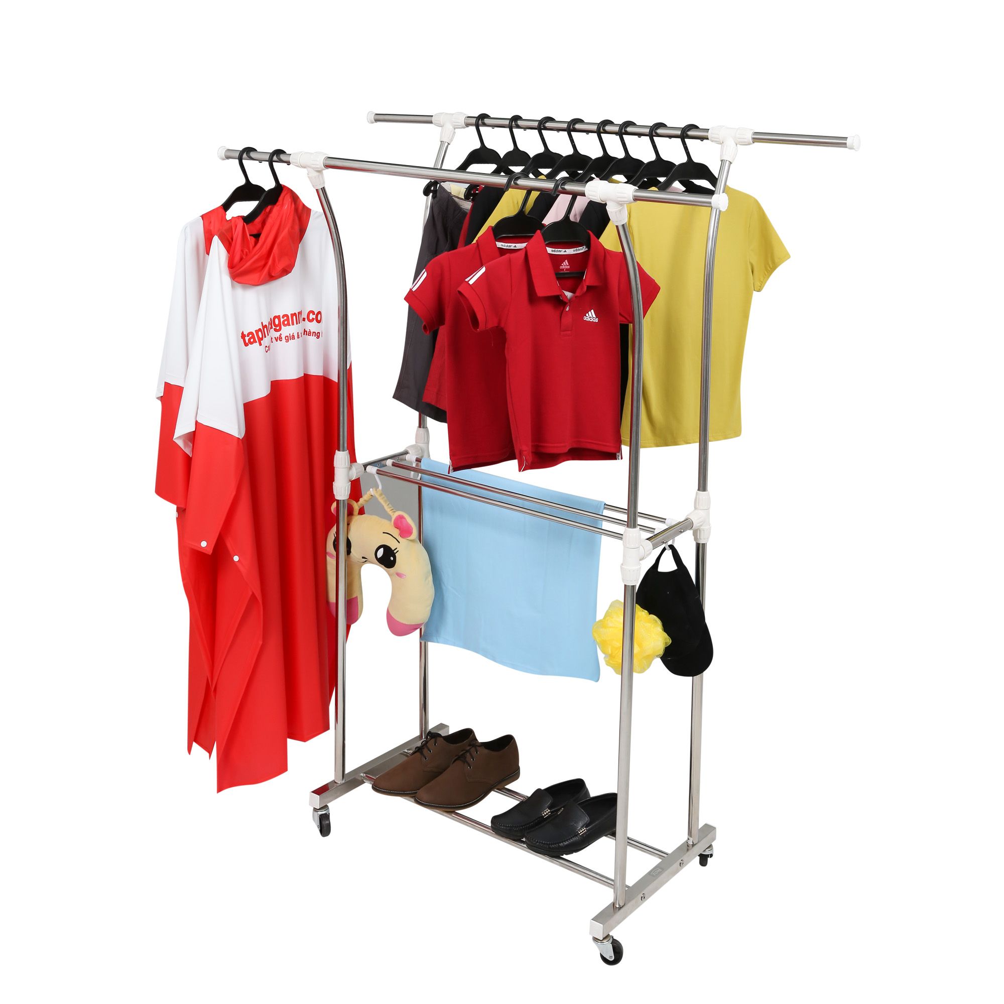 Sào phơi có thêm tầng máng khăn đa năng , có 4 móc treo đồ lót tiện dụng .